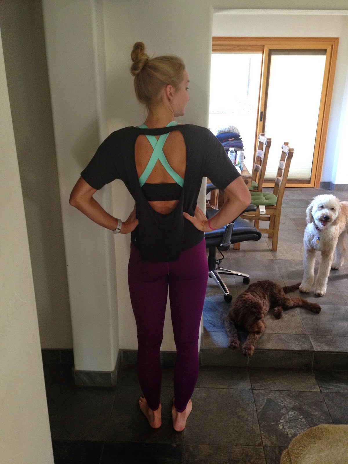 Top and leggings from Fabletics. Sports bra from Whole Foods (they truly have it all). Golden doodles from Heaven.