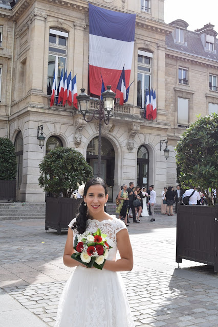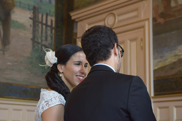 We went to get our hair done in a salon. The bride had her hair pulled to the side with curls and a white flower barrette. She looked royal! We all did our own makeup in the salon then met up with the rest of the family at the Paris City hall. In France, the religious ceremony has no significance to the state, so a courthouse marriage is required to be recognized as marriage in Paris. Sara and Oosama will have their big wedding party in Morocco on Sept. 4. I’ll be missing out, but I’m so glad to have been present for this.