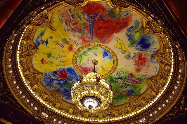 There’s an incredible, and fairly contemporary mural by Marc Chagall on the ceiling above the seating. It doesn’t fit the look of the rest of the place because the original mural was painted over in the 1950s. Some art critics call it an abomination, but I loved it. Charles Garnier, the architect, chose to make the seating and walls red because it put the ladies of the audience in a light which brought out the pink in their cheeks and made them look youthful. Crazy how much thought was put into how the audience of the main attraction would appear! This guy was concerned with every last detail.