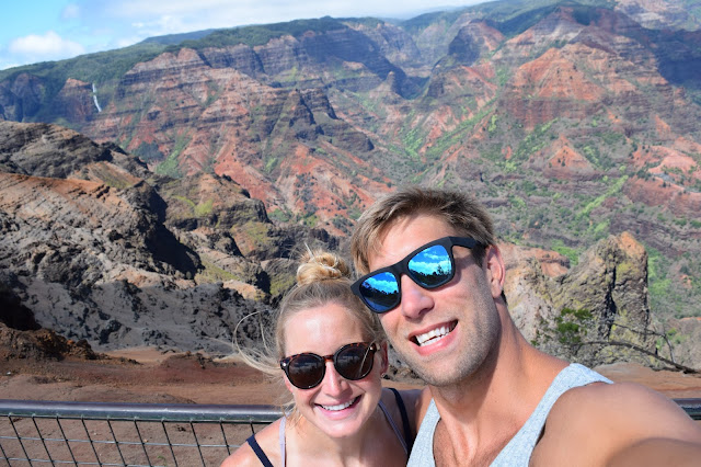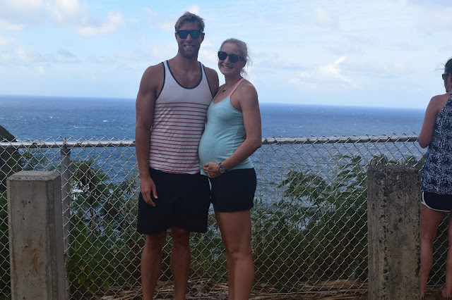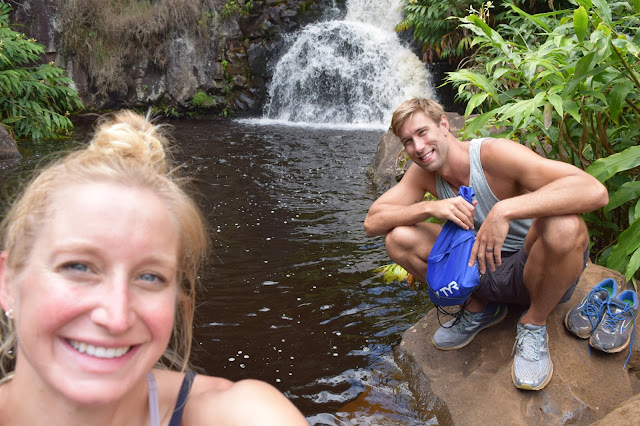 We drove up to another lookout where there was also a trail. The trail sign said “1.8 miles one way, 3-4 hours”. Challenge accepted. How bad could it be at 3.6 miles roundtrip? But dang, it wasn’t easy- there were some steep, red dirt descents and some steady climbs, but it led to a gorgeous secluded waterfall (Waipoo Falls). I won’t lie, there were a couple times I thought “Hmmm, I wonder if I should be doing this at 28 weeks pregnant?” But I was cautious and Matt made sure to stay close by in case of any clumsy missteps. The whole hike was somewhat spontaneous…I had heard there was a hike, but I heard it was short and sweet. This one took us a little over two hours. It was a great workout! Matt and I were both smelly by the time we climbed back into our little red Hyundai Sonata. Fatigue set in as we descended back down to sea level.