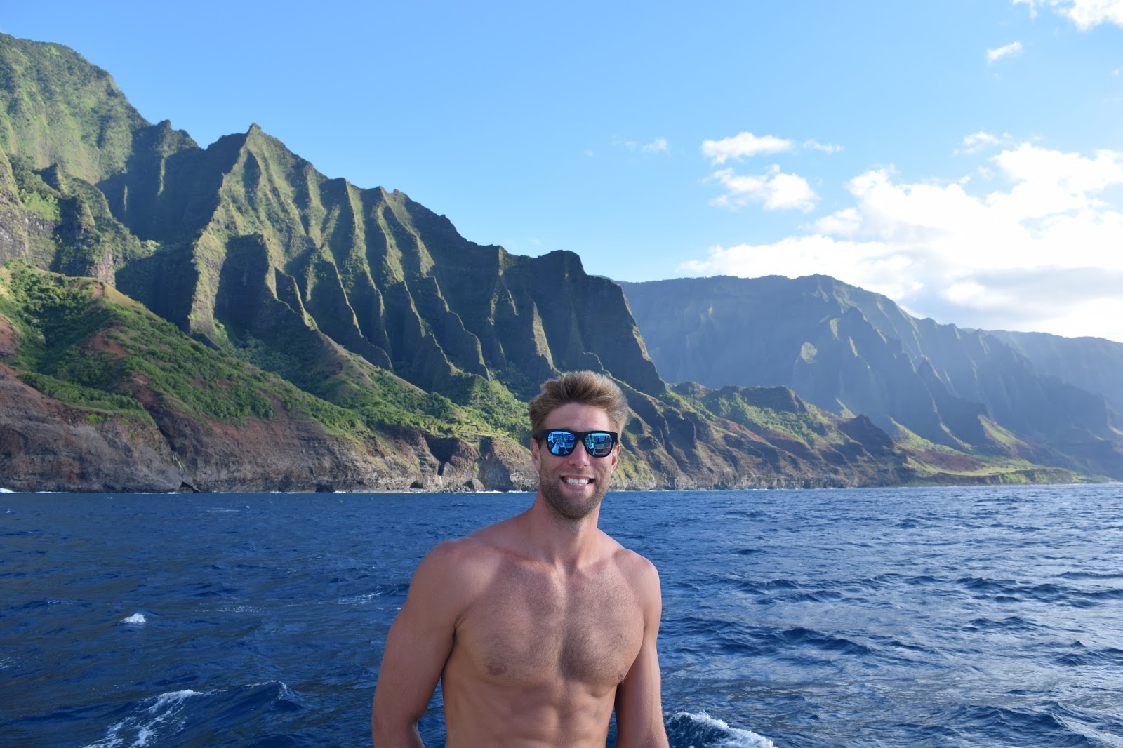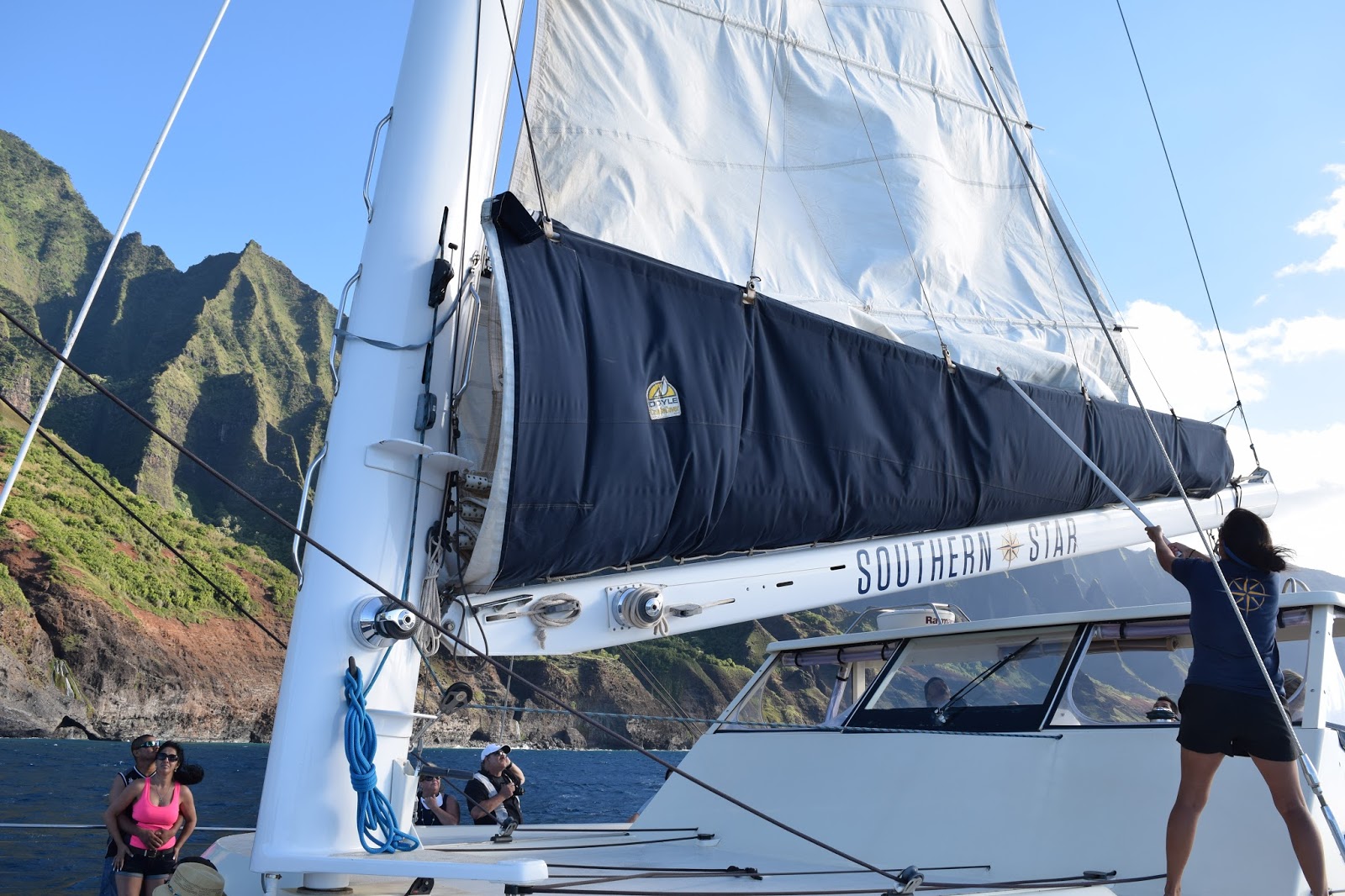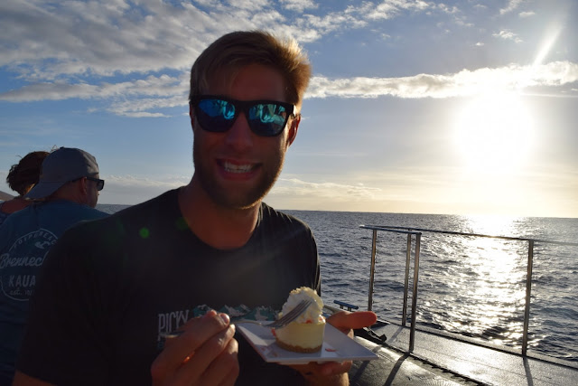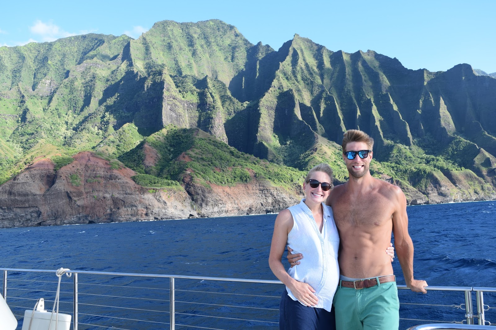 We rinsed off and got ready for our sunset sailing excursion along the Na Pali Coast. If you don’t know what this looks like, just picture the ridged, lush mountains in Jurassic Park and you’re there. We were on a 60-person catamaran, which felt way more intimate than that. We made friends– a couple from San Diego expecting their second child (Kristen and Jeff were their names) and Bryana, an engineer working in Chicago who was flying solo on the cruise.