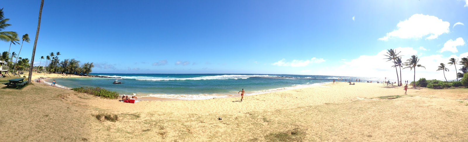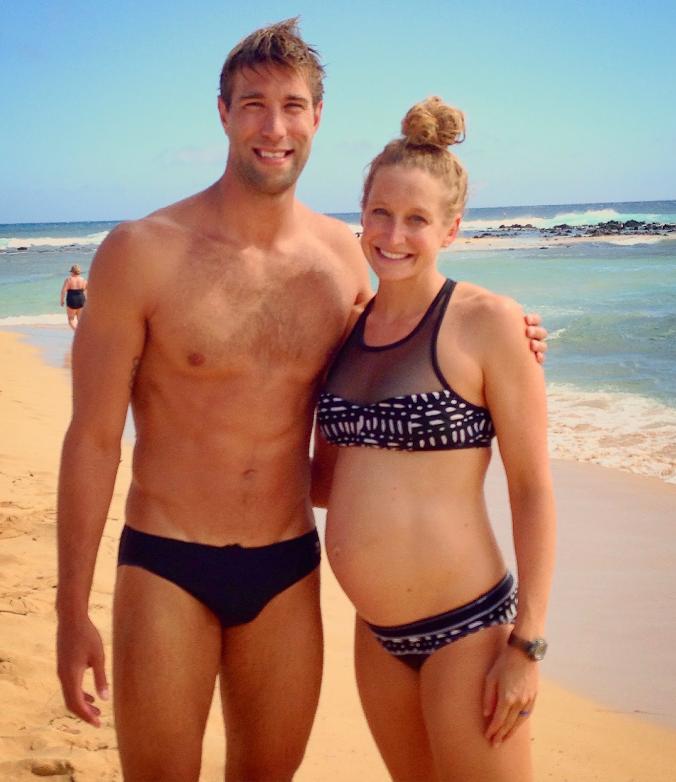 After growing bored with poolside scenes, we packed our bag and headed down the street to Poipu Beach. It was recommended for snorkeling, but the current was a little too strong for snorkeling. We tried and ended up seeing a vibrant rainbow fishy, but didn’t last long out in the windy conditions. The funniest part of this experience was watching onlookers’ reactions as Matt took his shorts off. People didn’t even attempt to be discreet– they were obviously not expecting to see my 6’8 colossus sporting just a brief on the beach. I, of course, was gleaning stares as well– a very protrusive third trimester belly popping out between my bikini pieces. Stare away, Poipu Beachers!