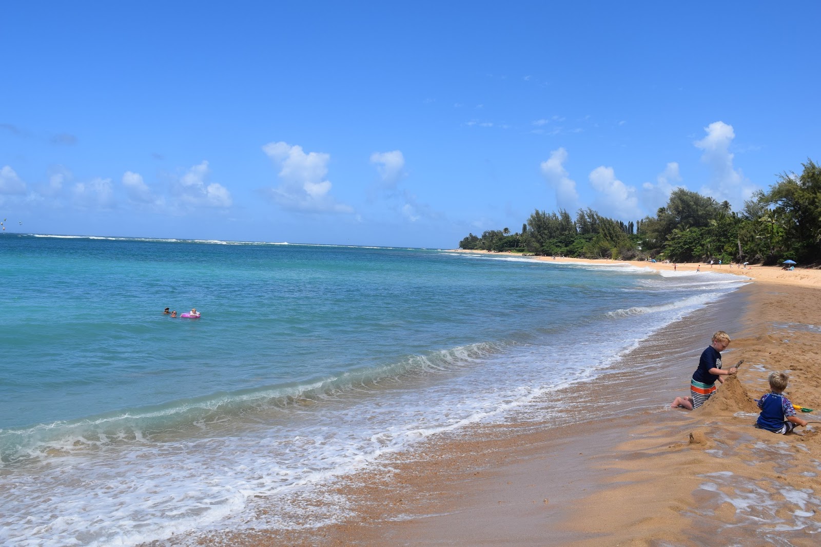 We shopped around, found MG some nice long fit-for-surfer shirts and then stopped at the Hanalei Pier, which our waitress recommended. Hanelei is a calm inlet, away from the crashing waves and strong current common on the north shore. A bunch of kiddos were taking surf lessons on mini waves– ’twas cute.